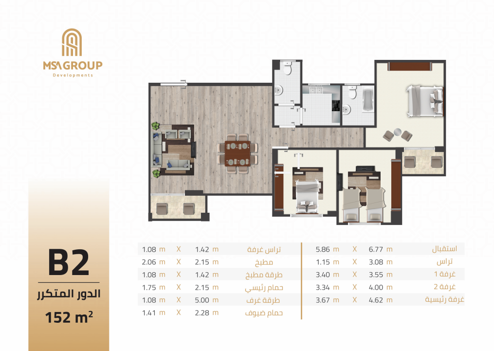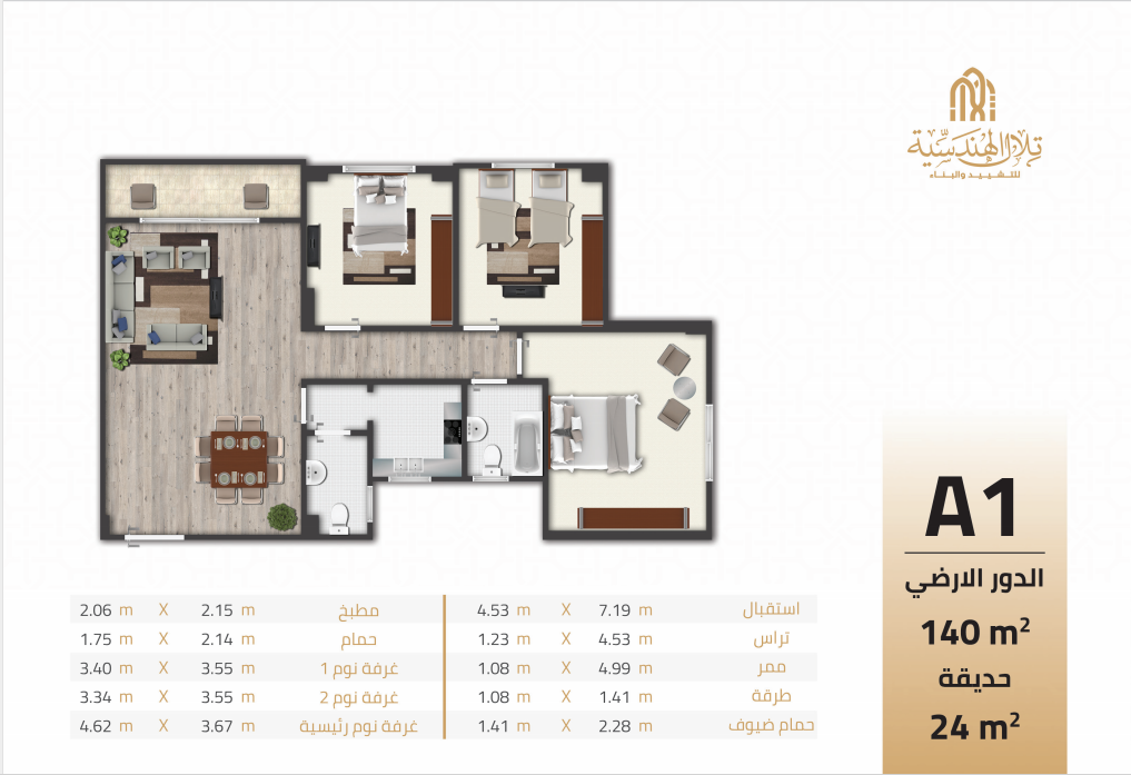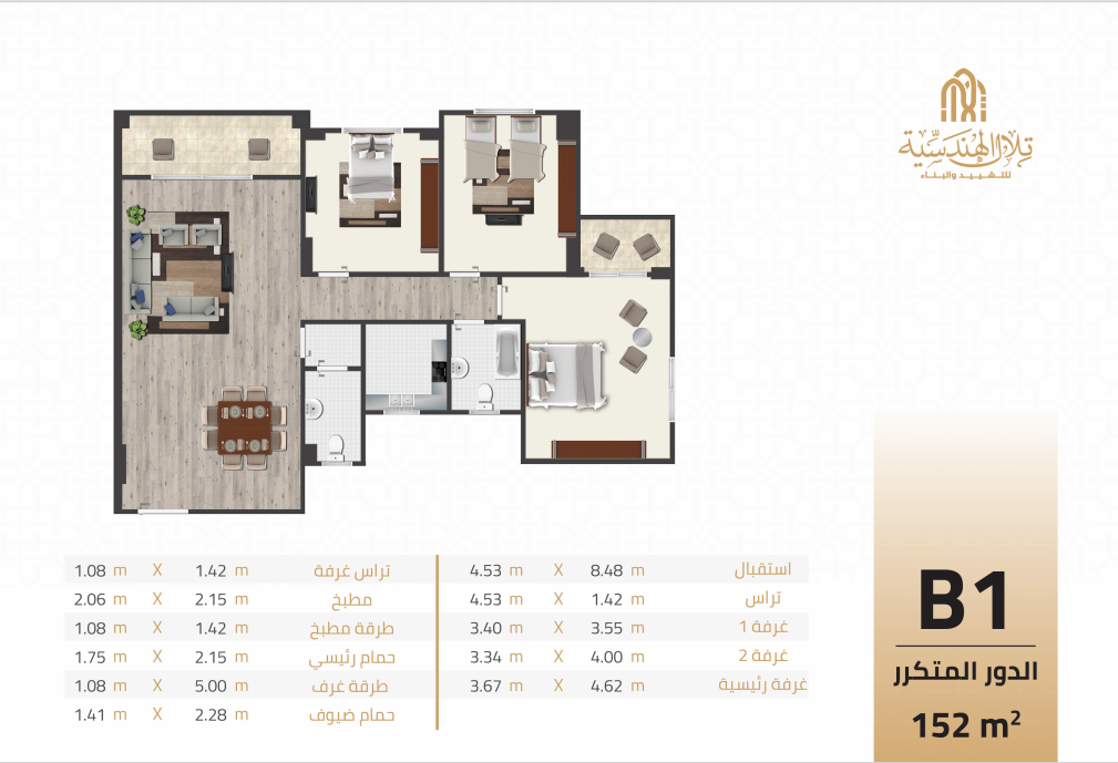 Each floor contains a twilight, and each apartment is divided into 3 bedrooms and a reception area. It consists of 3 pieces, 2 bathrooms, a kitchen, and no terrace. The units are designed in a way that meets customer requirements and provides optimal use of internal spaces.